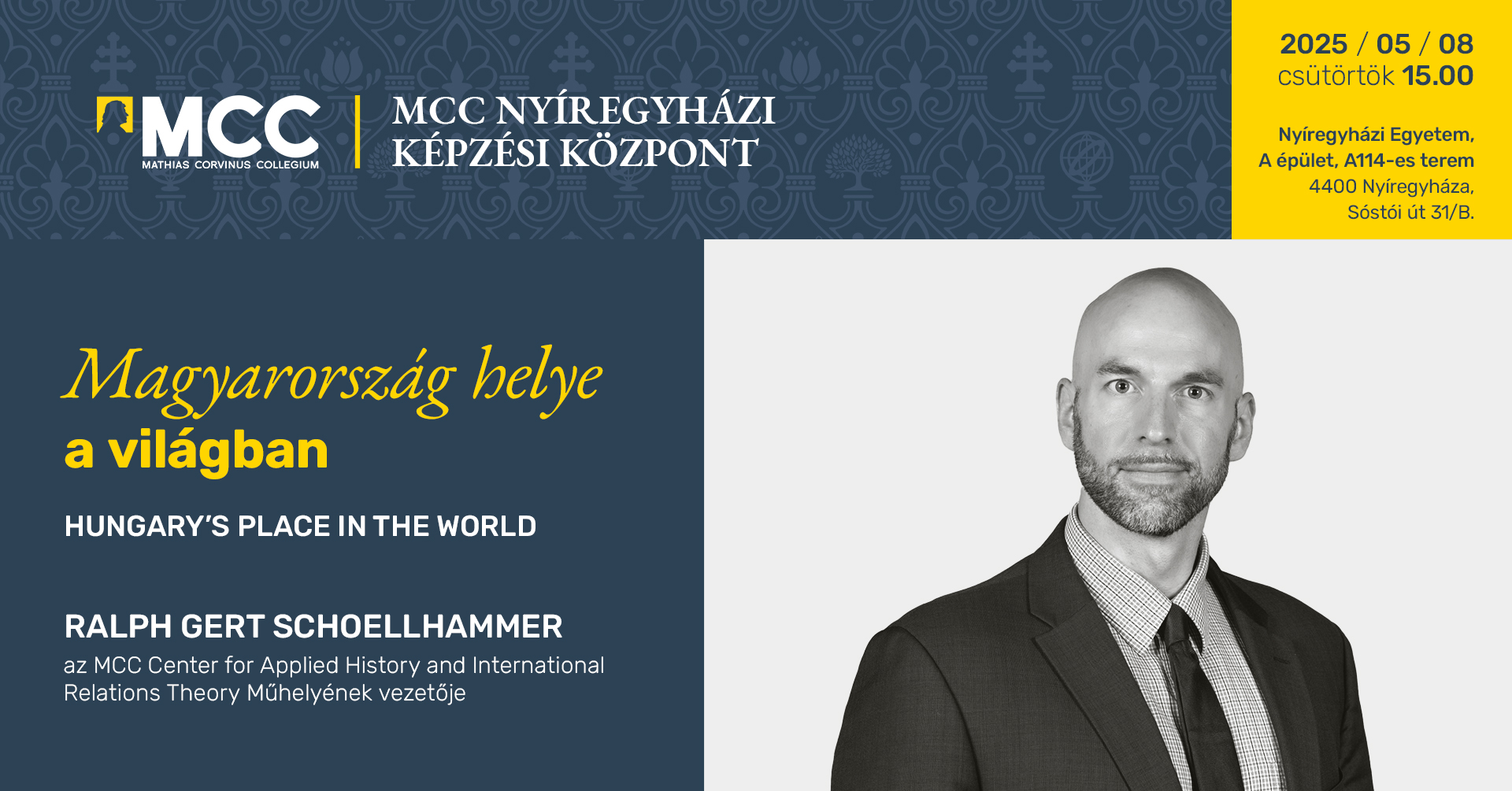 Ralph Schoellhammer: Magyarország helye a világban Hungary’s Place in the World című előadását tekinthetik meg az érdeklődők a Nyíregyházi Egyetemen, 2025. május 8-án (csütörtökön) 15:00 órától, az A épület, A114-es dísztermében. Az esemény moderátora: Dr. Ulrich Attila PhD, történész, docens (Nyíregyházi Egyetem). A program az MCC Nyíregyházi Képzési Központja és a Nyíregyházi Egyetem közös szervezésében kerül megrendezésre. Az eseményre kérjük a résztvevők előzetes regisztrációját!