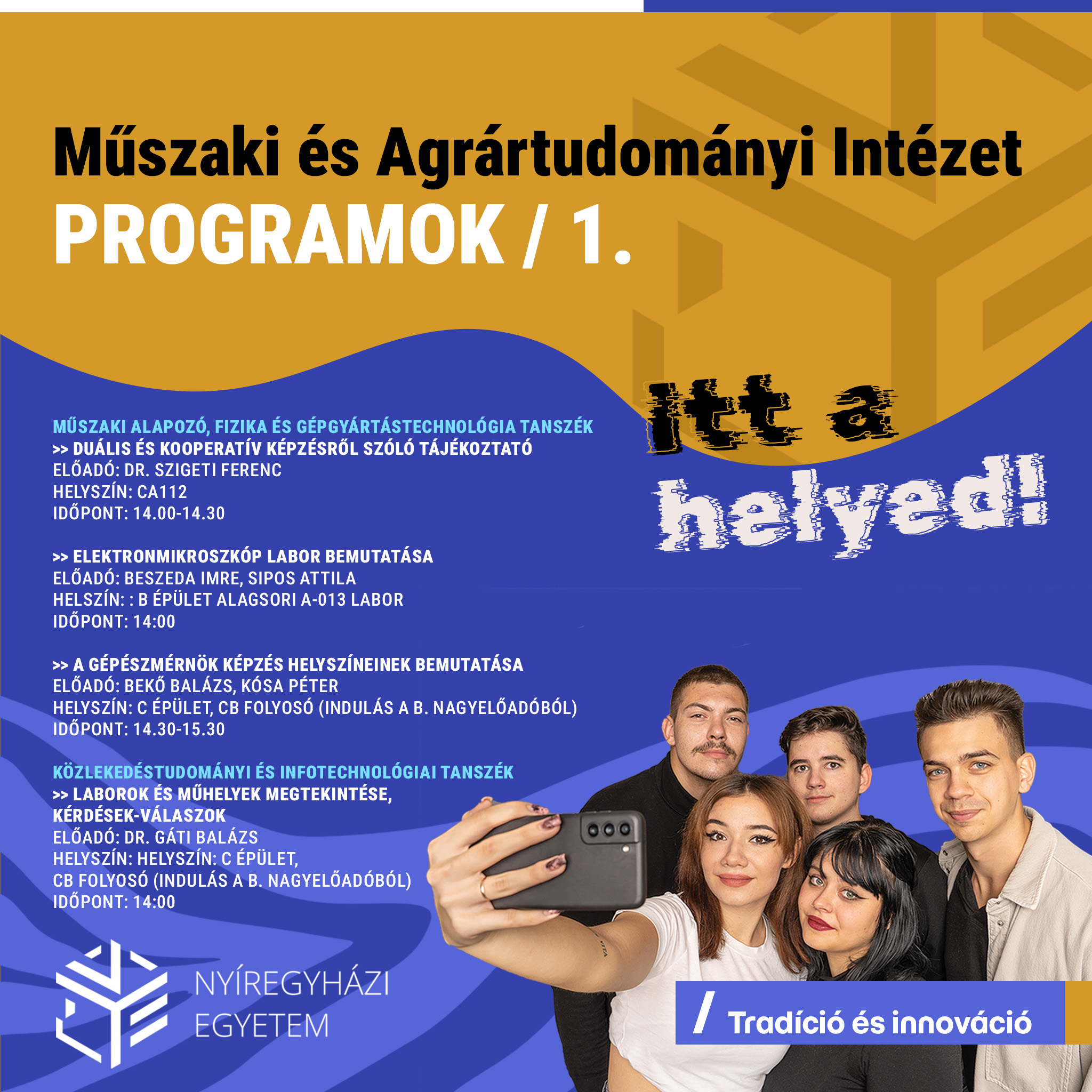 Program: Szakok bemutatása, hallgatói tapasztalatok, kutatási lehetőségek az intézetben.