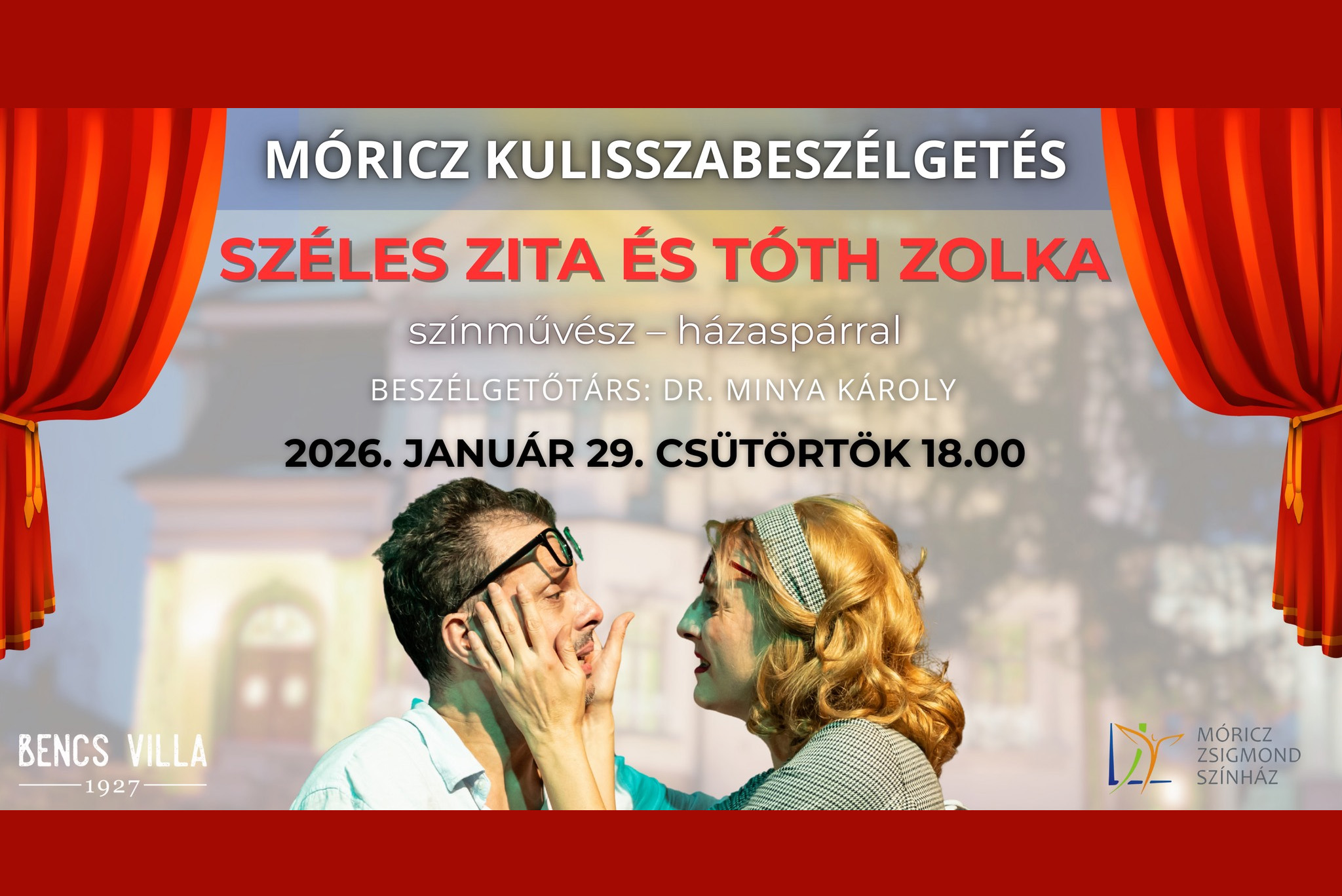 Január 29-én 18 órától a Bencs-villában Széles Zita és Tóth Zolka színművészházaspár pódiumbeszélgetésre várja az érdeklődőket. Az eseményt Dr. Minya Károly, a Nyíregyházi Egyetem Nyelv- és Irodalomtudományi Intézetének intézetigazgatója vezeti. A 25 éve a társulat tagjaként dolgozó művészek többek között legutóbbi szerepeikről, megismerkedésük történetéről, az azonos hivatásból fakadó előnyökről és kihívásokról is beszélnek. Emellett szó esik a humor mindennapjaikban betöltött szerepéről és arról is, miként hasznosul a színészi mesterség a civil életben. A beszélgetés pályaválasztási dilemmákat és alternatív életutakat is érint.